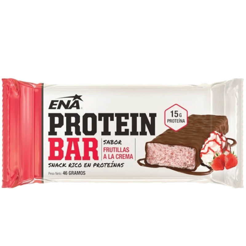 ENA Protein Bar es un suplemento dietario en barra, ideal como snack rico en proteínas. Con un delicioso sabor a frutillas a la crema y un baño de chocolate semiamargo, es la opción perfecta para complementar tu nutrición.